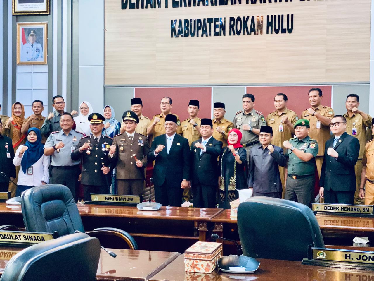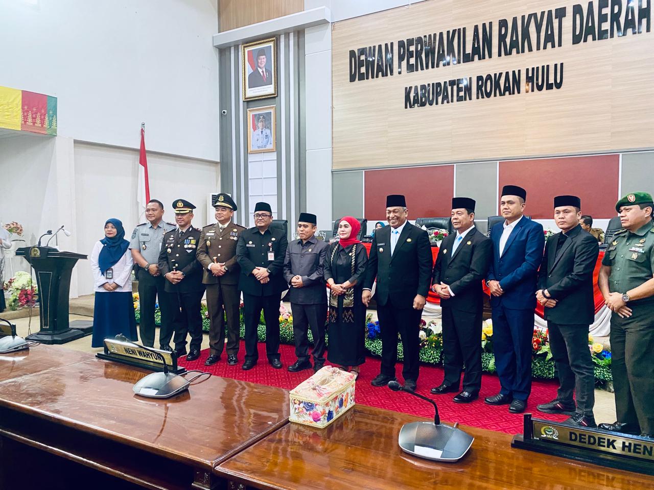Sejumlah pejabat turut menghadiri acara tersebut, termasuk unsur Forkopimda, Sekretaris Daerah (Sekda) Rohul Muhammad Zaki S.STP M.Si, asisten, staf ahli, kepala OPD, serta perwakilan dari KPU dan Bawaslu.